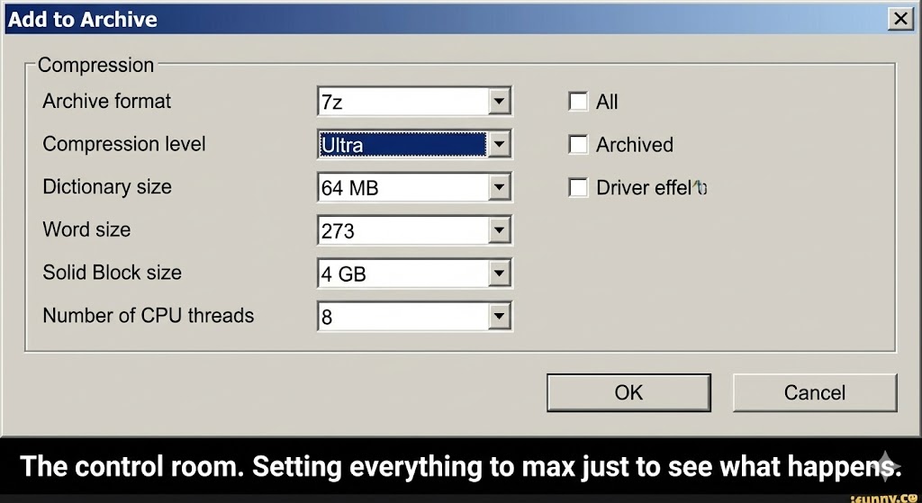 - Complex Settings: The “Add to Archive” box has options like “Dictionary size” and “Word size” that will confuse average users. (Pro tip: Just leave them on default).
