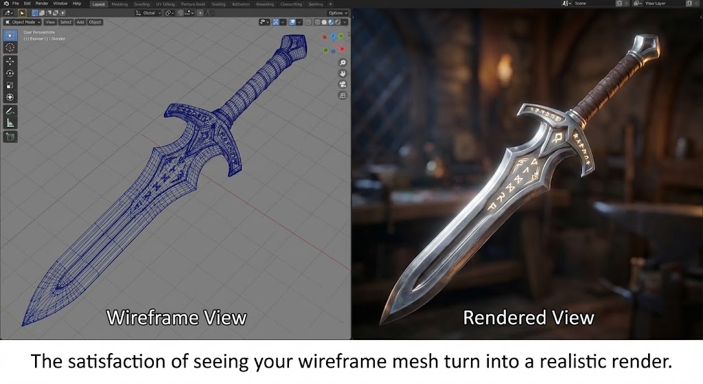 - Eevee is the speed demon. It renders in real-time (like a video game engine). I remember switching to “Rendered View” for the first time and seeing my ugly grey blob turn into realistic gold. That dopamine hit is addictive.